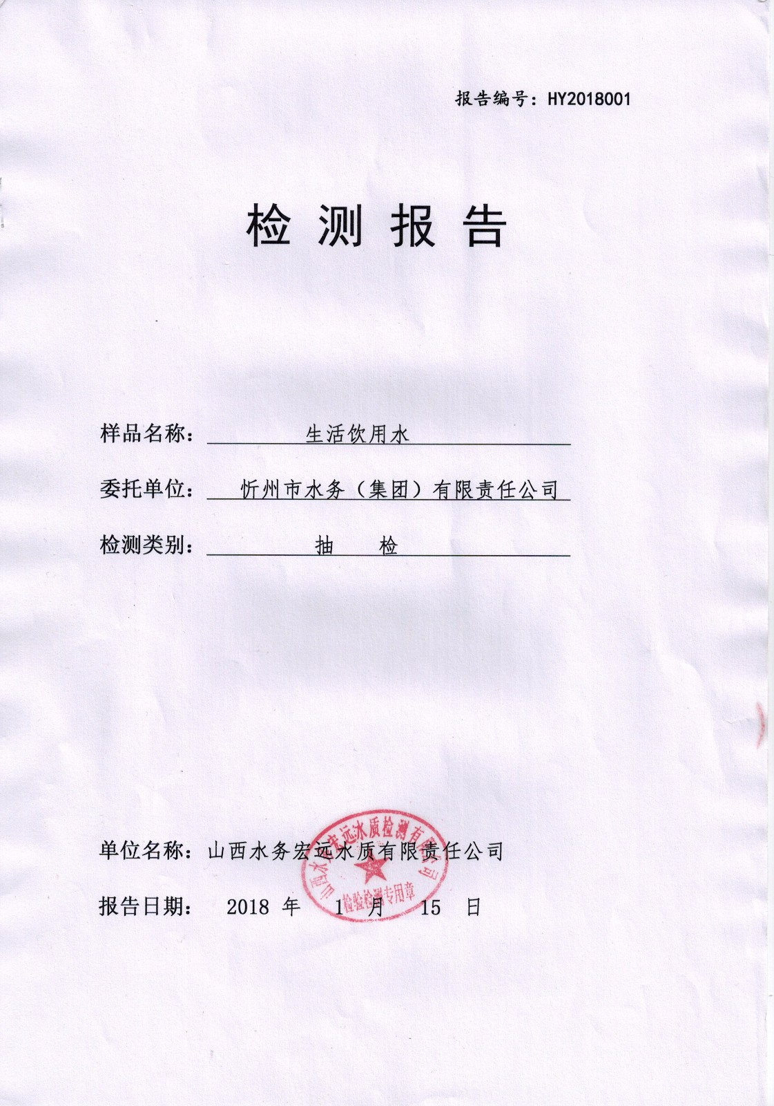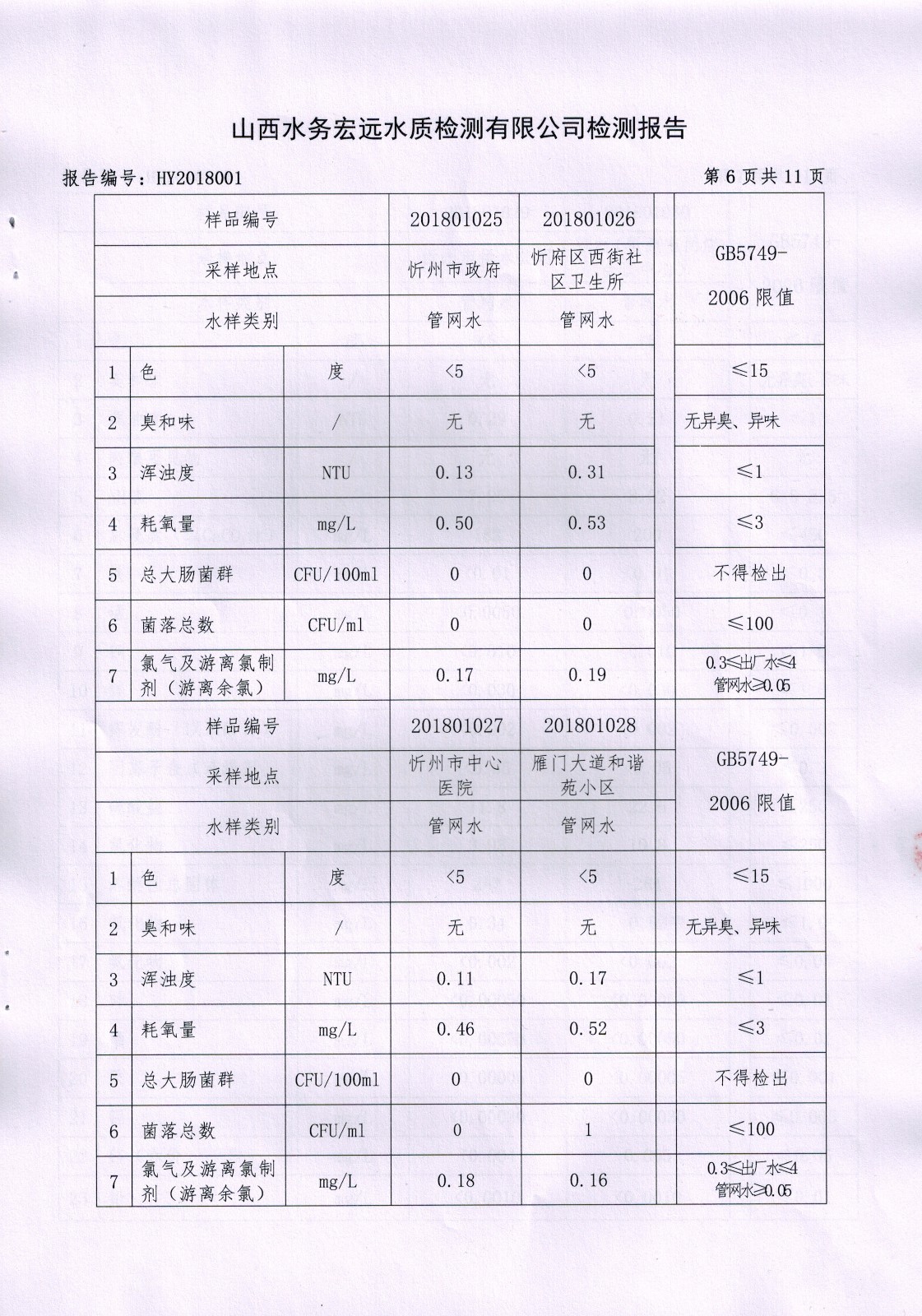 忻州城區(qū)公共供水水源水、出廠水、管網水、管網末梢水2018年1月份水質信息公示