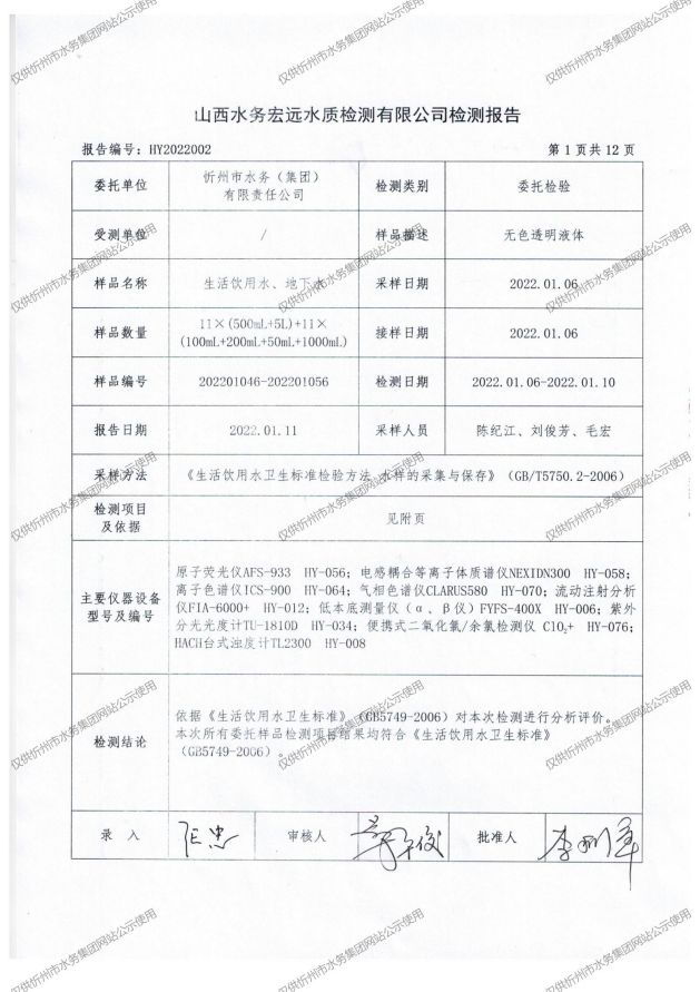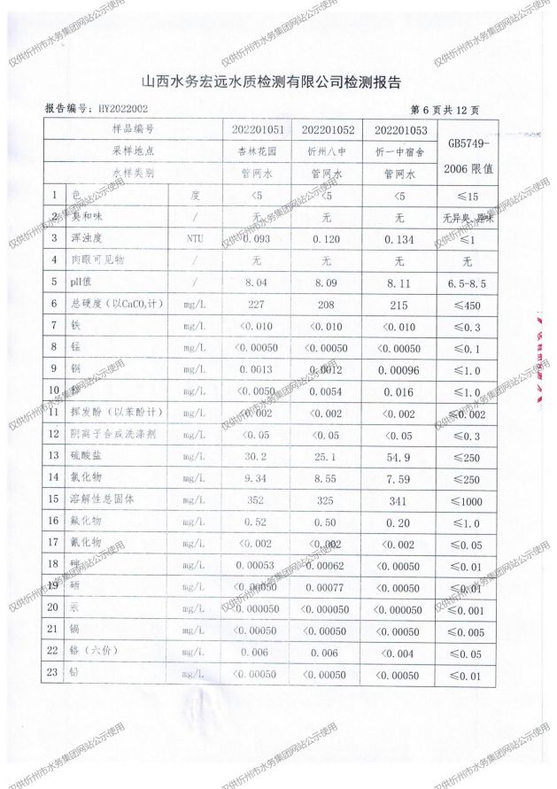 忻州城區(qū)公共供水水源水、出廠水、管網水、管網末梢水2022年1月份水質信息公示