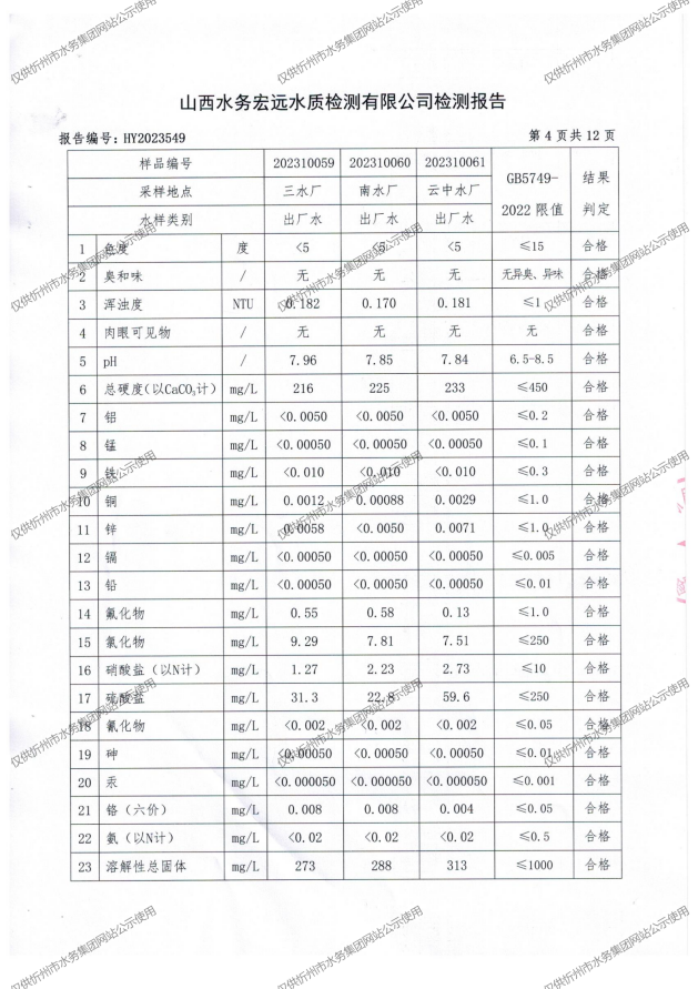 忻州城區(qū)公共供水水源水、出廠水、管網(wǎng)水、管網(wǎng)末梢水2023年10月份水質(zhì)信息公示
