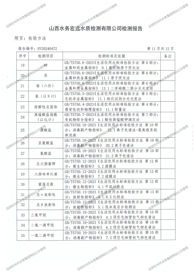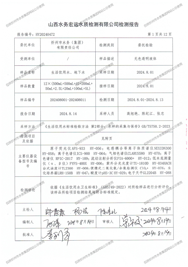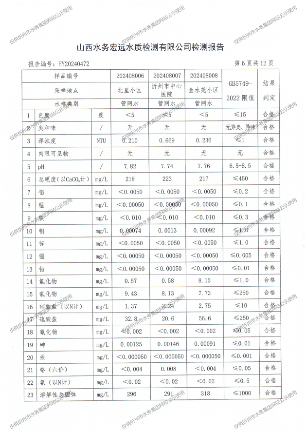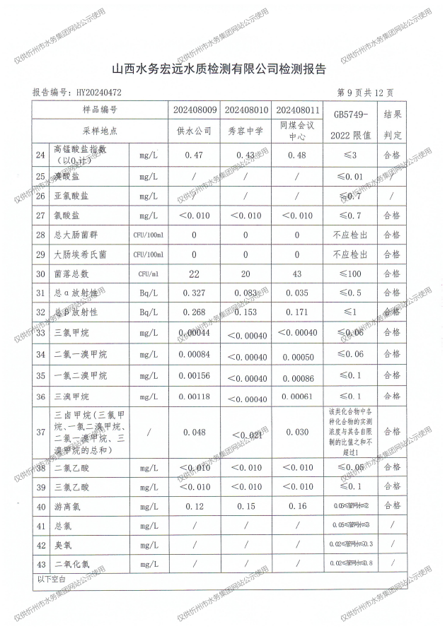忻州城區(qū)公共供水水源水、出廠水、管網(wǎng)水、管網(wǎng)末梢水2024年8月份水質信息公示